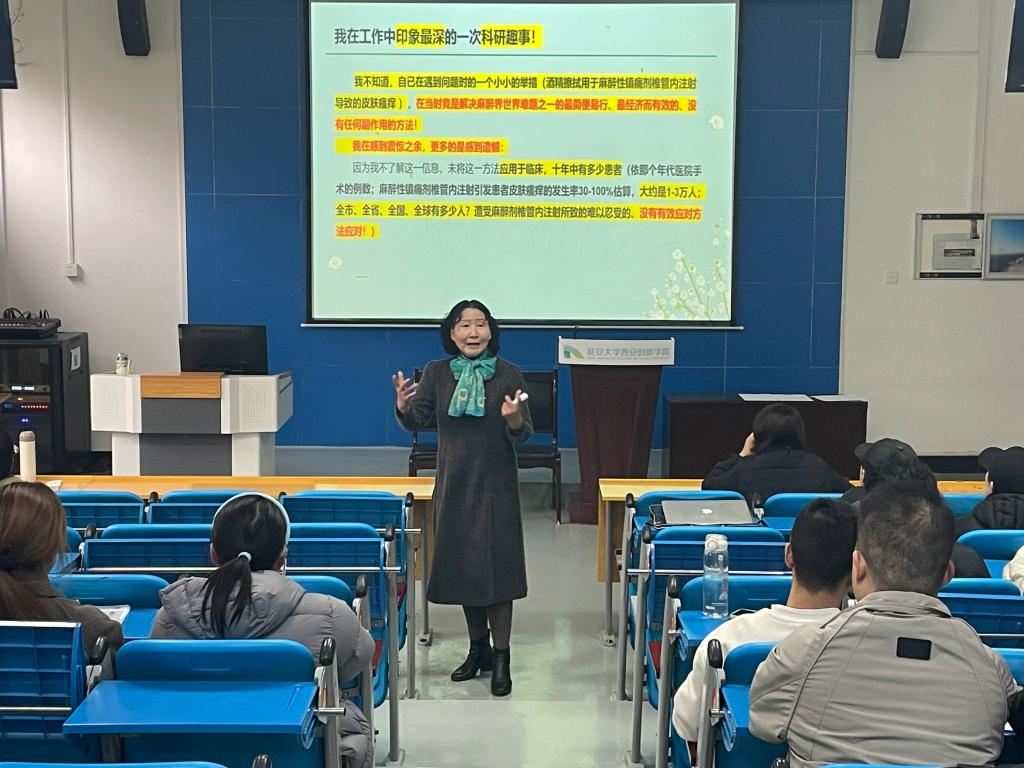 讲座中,李惠敏老师立足自身数十年临床护理与教学科研双重经验,以“酒精擦拭用于缓解麻醉性镇痛剂椎管内注射所致皮肤瘙痒”这一真实临床案例为核心切入点,生动拆解了“从日常工作发现科研问题”的思维路径。她详细讲述了从留意到患者因麻醉用药出现皮肤瘙痒的临床痛点,到系统查阅国内外文献、分析现有解决方案的局限性,再到反复验证酒精擦拭方法的安全性与有效性,最终实现技术改进并应用于临床的完整过程,为在场教师提供了“从实践到科研”的可复制方法论。